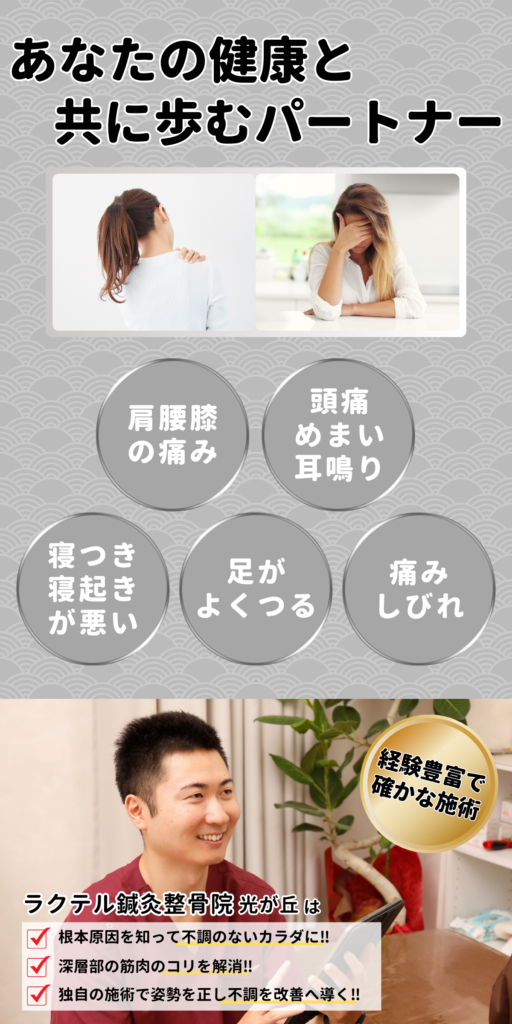 ラクテル鍼灸整骨院 光が丘の施術は、痛みの無いソフトな施術で根本原因になっている筋肉のバランス調整や骨格のゆがみを正します。