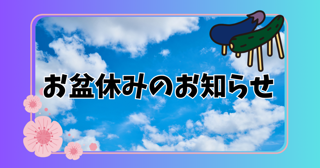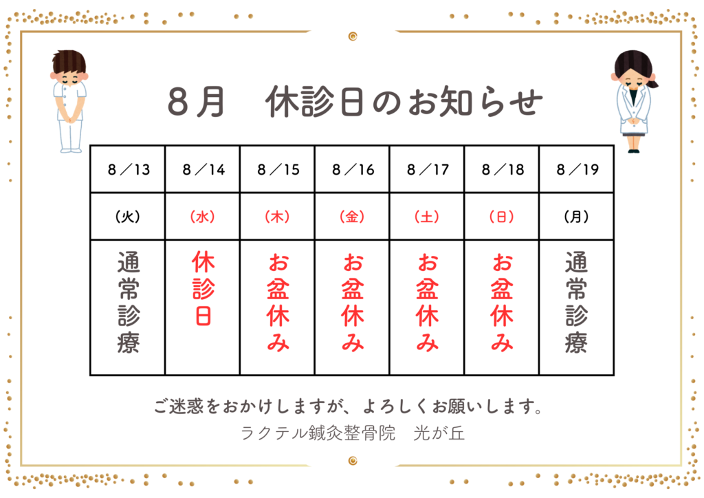お盆休みのお知らせ 2024.08.09 こんにちは🌞お盆休みの休診日は上記の通りです! 14日~18日は休診日になります。また、19日は混みあうことが予想されますので、早めのご予約をお願いいたします♪ご迷惑をおかけしますが、よろしくお願いいたします(^^♪