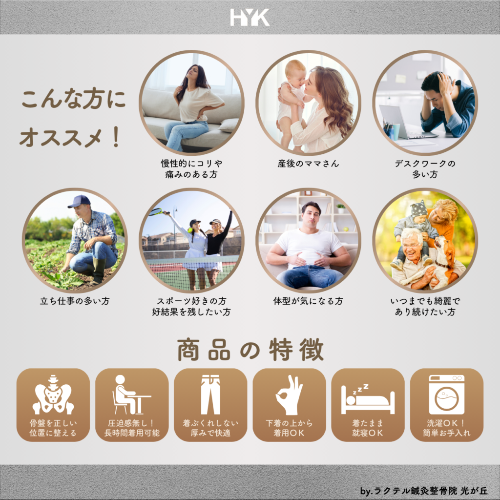 従来品にない骨盤まわりの各部位を本来あるべき方向へ導くサポート方法。特許取得済↑